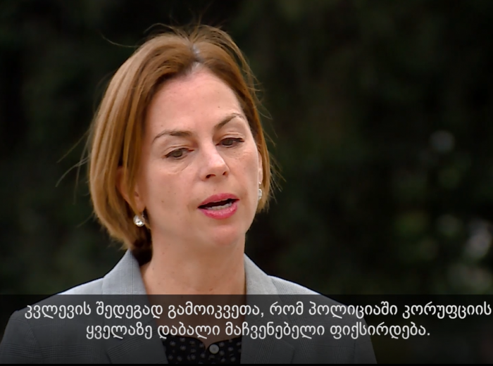 "ჩვენ ჩავატარეთ გამოკითხვა, რომელიც ეხებოდა კორუფციის მაჩვენებელს სამინისტროებსა და ადგილობრივი თვითმმართველობის ორგანოებში. კვლევის შედეგად გამოიკვეთა, რომ სახელმწიფო ინსტიტუტებიდან პოლიციაში კორუფციის ყველაზე დაბალი მაჩვენებელი ფიქსირდება. მოსახლეობის აზრით, კორუფციის ყველაზე მაღალი მაჩვენებელი სამინისტროებსა და ადგილობრივ თვითმმართველობის ორგანოებში ვლინდება,’’- განაცხადა ლორა თორნტონმა.
